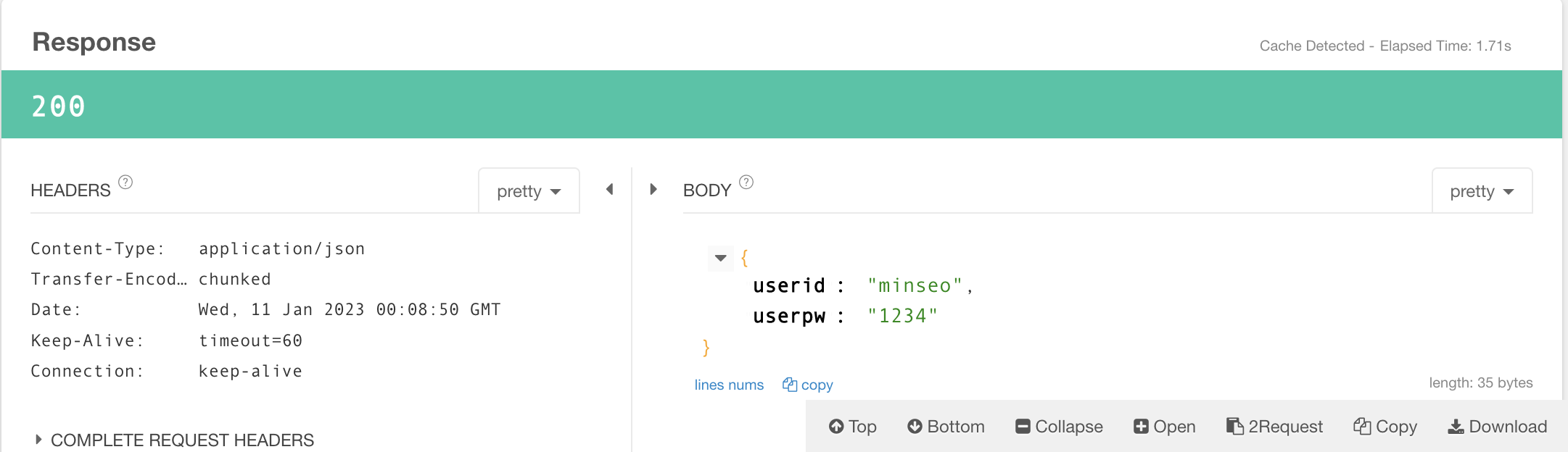 1) 잘못된 입력 - 303 입력받은 json데이터의 이름이 잘못되어 userId와 userPw가 반환되지 않는 경우